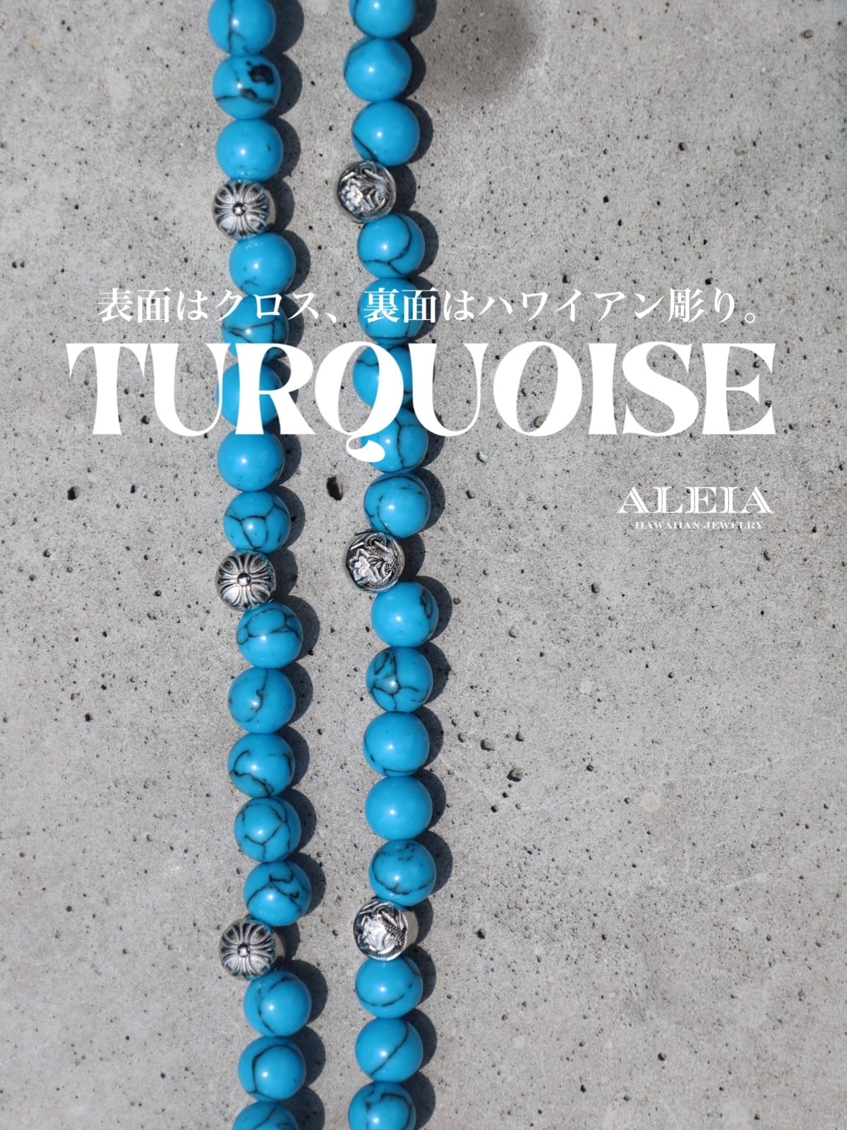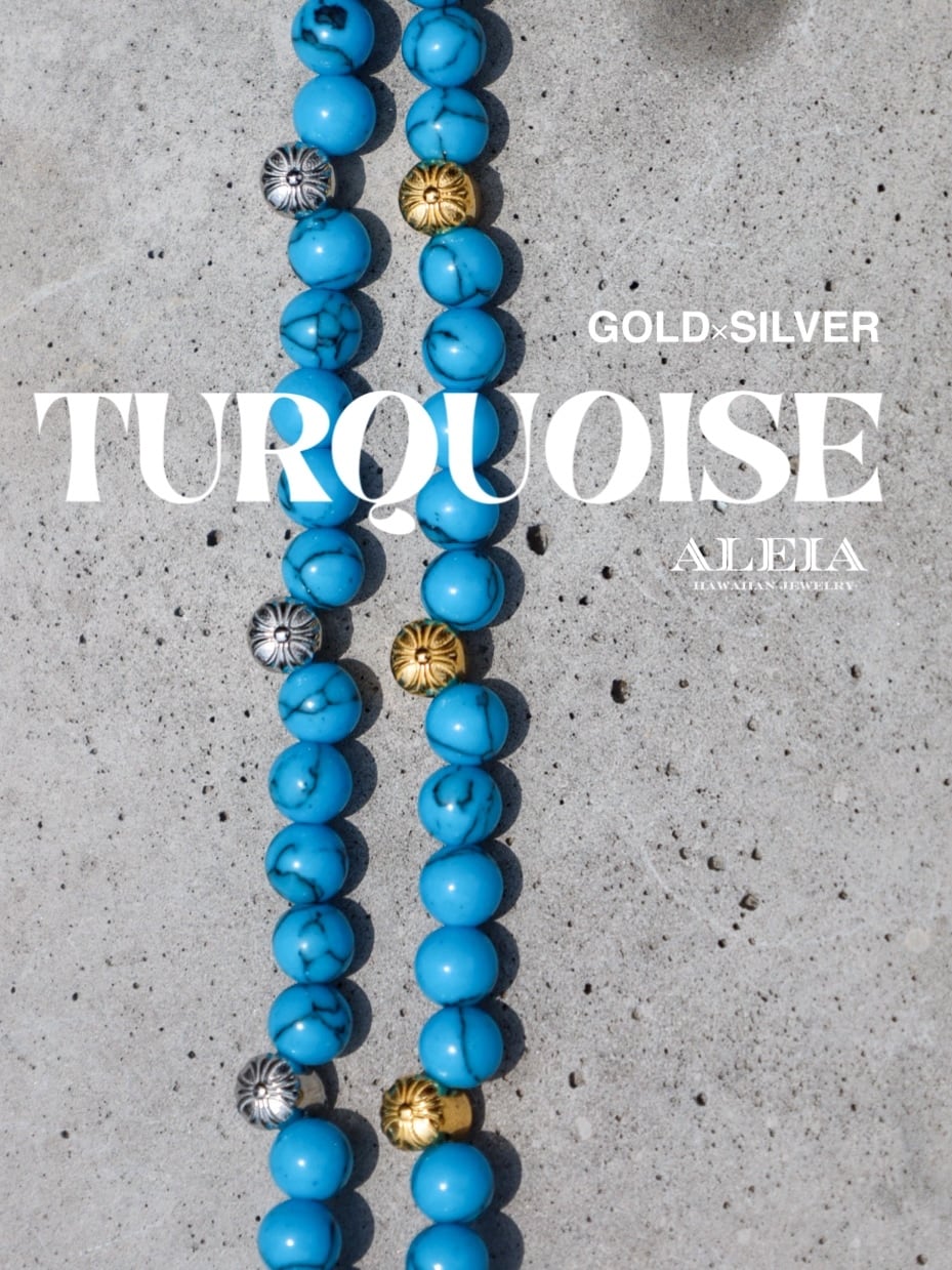 ターコイズの清涼感と、サージカルステンレスのクロス×ハワイアンビーズが上品な輝きが融合した、ハワイアンテイストのネックレスです。